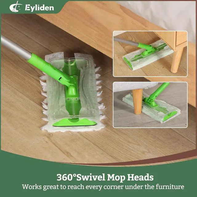 Upgrade Patented Design Sweeper Mop DeviceCompared to other disposable dust mop device, Eyliden engineers have designed a unique buckle cover that keeps both disposable floor cleaning dry & wet mop pads securely fastened to the sweeper mop driver, so you' ll never have to worry about the mop pads falling off during use. The long handle prevents your body from bending. 360 degree swivel head, you can mop around the stairs, furniture and table legs flexibly
