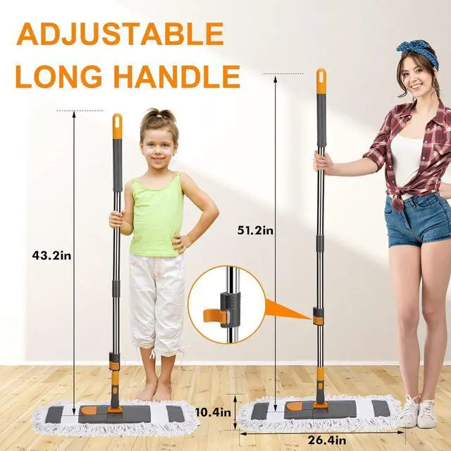 Extendable Long Handle: The microfiber mop has stainless steel pole, can be adjusted up to 49 through opening the locking buckle on the handle without causing back pain. You can adjust the proper height according to your needs. The handle is lightweight and is friendly for elderly and children.