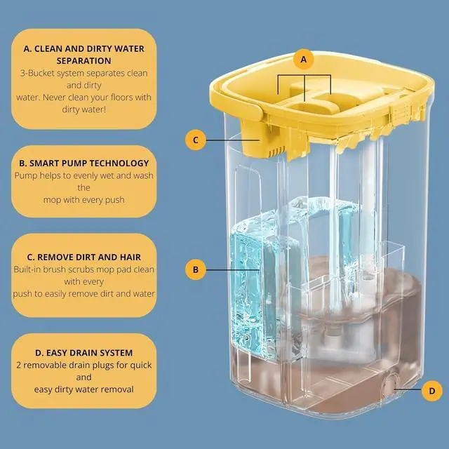 SEPARATE COMPARTMENTS FOR CLEAN AND DIRTY WATER Featuring dual compartments, this system ensures the mop always uses fresh water for cleaning, keeping your floors and surfaces impeccably clean every time.