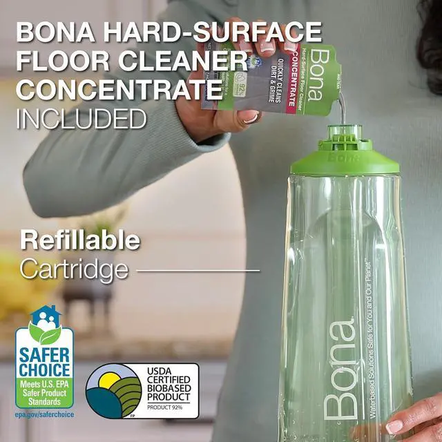 HARD FLOOR CLEANER CONCENTRATE: Rinse-free, streak-free hard-surface floor cleaning solution leaves hard floors clean and beautiful; Just pour the contents of the concentrate pouch into your Bona spray bottle or mop cartridge and fill the rest with water