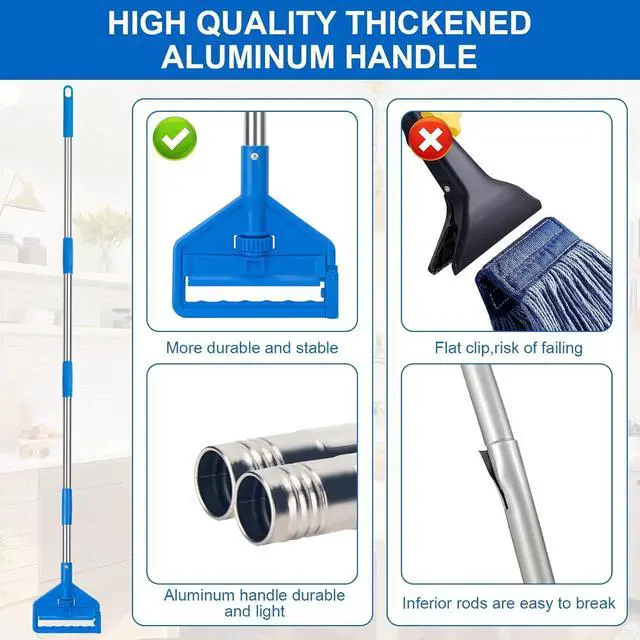 Sturdy HandleThe handle of the industrial mop is made of thickened stainless steel, with a reinforced design between the poles, making it more sturdy and durable. The 60-inch long mop allows you to stand upright and clean, reducing waist pressure.