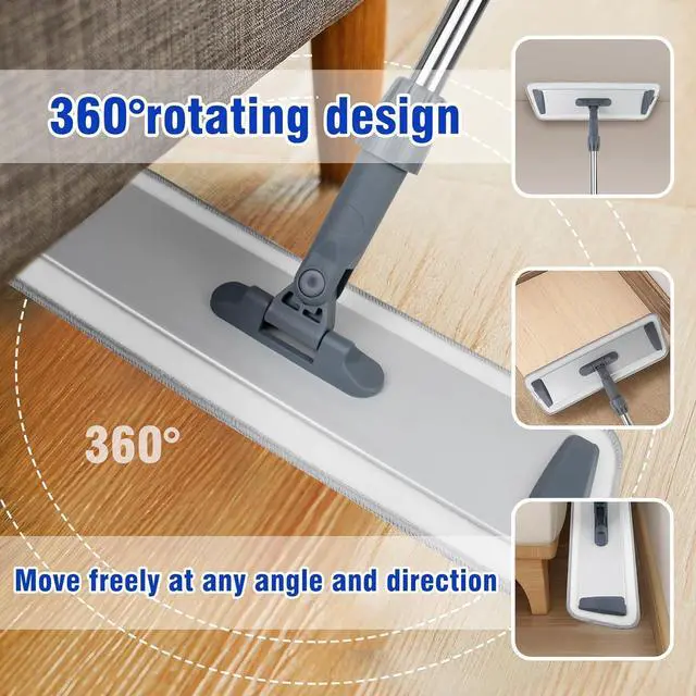 360° Rotating HeadOur Microfiber Flat Mops features a ultra-slim flat mop head that can be flexible rotated 360 degrees, which allows you to effortlessly wipe up all hard to reach areas in the house, such as deep corners in the kitchen bathroom or under the sofa, bed, cabinet and other furniture. The flat design makes the floor mop head easier to clean the edges and corners, which makes the floor cleaner mop a simple but convenient and effective cleaning tool.