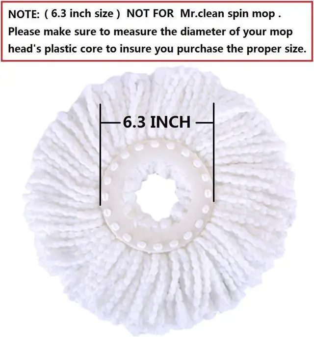 Inch SizeNOTE: Please make sure to measure the diameter of your mop head' s plastic core to insure you purchase the proper size. Our mop head is round and plastic core is 6.3 " diameter. Our mop heads fit most spin mops with a plastic round diameter between (6" - 6.3 " ). But NOT FIT the Mr. clean spin mop.