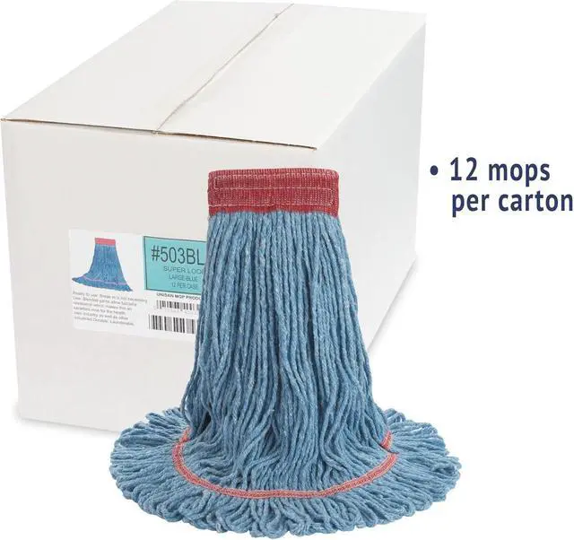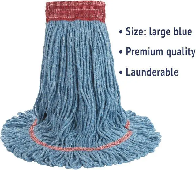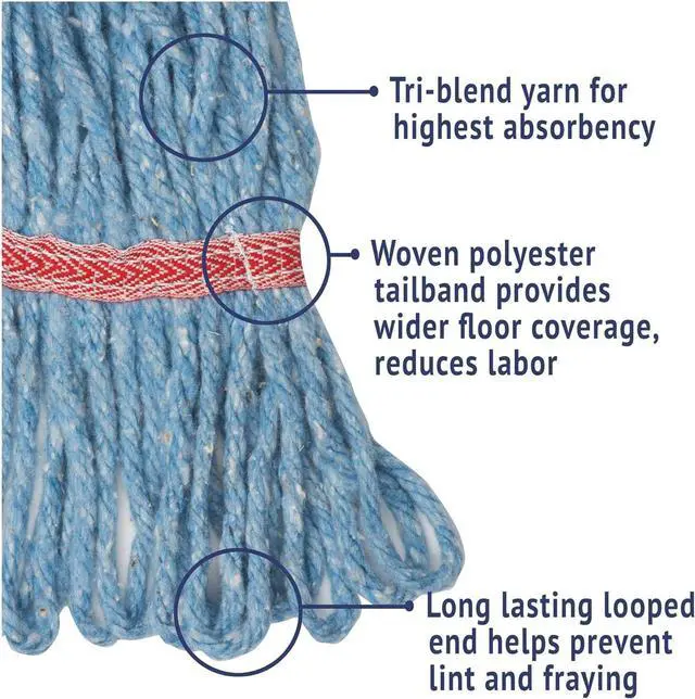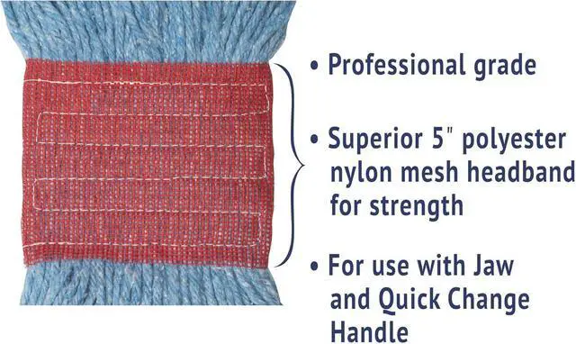 Sold as 1 Each. Premium-quality, four-ply cotton/synthetic yarn mop head for high-volume use. Absorbs up to seven times its own weight. Heavy-duty, 5" vinyl headbands. Looped ends help reduce streaking. Launder in mesh bag.
