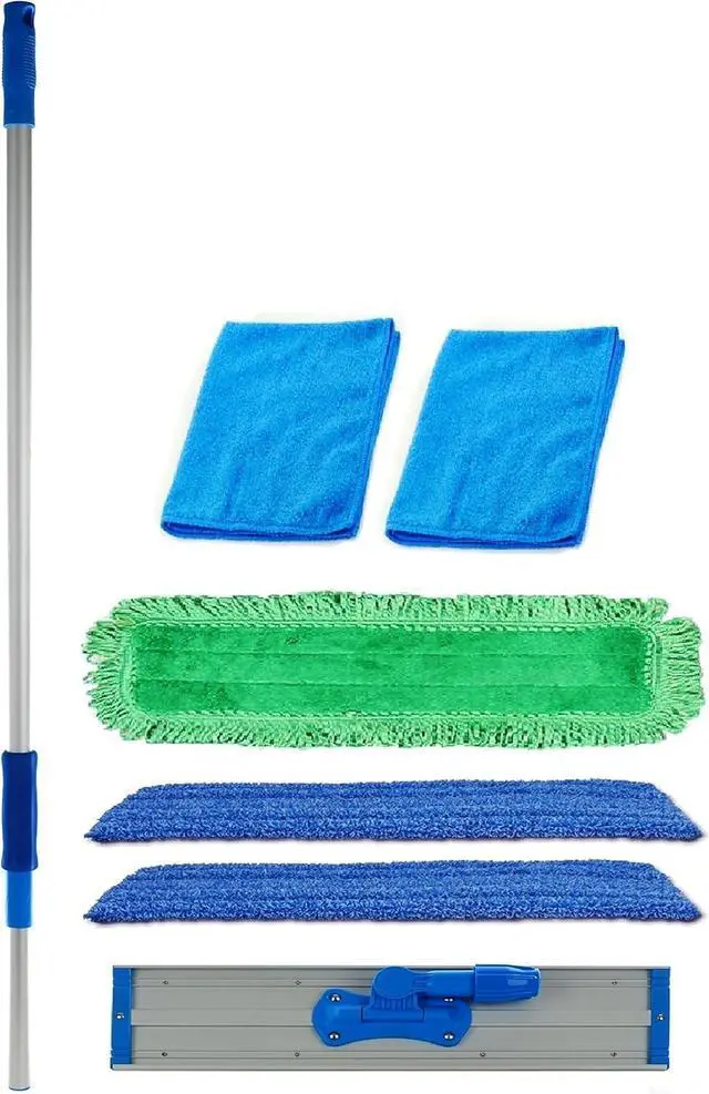 Kit Includes: (2) 24" Blue Premium Microfiber Wet Mop Pad, (1) 24" Premium Fringe Microfiber Dust Mop Pad, (1) 70" Durable and Lightweight Telescopic Aluminum Handle, (1) Heavy Duty Aluminum Mop Frame and 2 Bonus Microfiber Super Towels