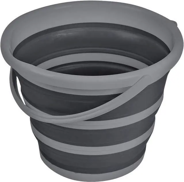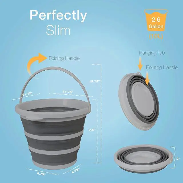2.6 GALLONS COLLAPSIBLE BUCKET - a collapsible bucket is the perfect addition to your home and camping essentials. Featuring a space saving design, this strong and sturdy 10L bucket folds down flat in seconds, which is perfect for storing in compact spaces.
