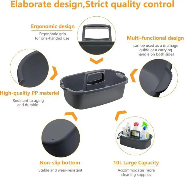 Easy to carryThe cleaning tote has a groove carry handle for convenient fit in hand. A non-slip design at the bottom can keep you steady and firmly. Both sides of the basket have a water guide-port, easy-to-pour water, or two-handed grip; the storage basket is lightweight, allowing it easy to pick up and hang.