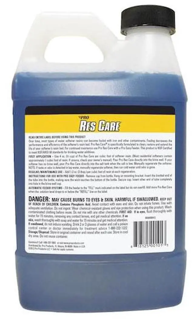 Res Care is a specially formulated liquid resin cleaner designed to rid the softener of contaminants that salt alone cannot remove. Regular use of Res Care resin cleaner will restore the softener beads and control valve parts back to peak efficiency and maintain the life of the unit. For best results, use an Easy Feeder for continued defense of contaminant buildup. Protect your water softener by using Res Care on a regular basis. Pour 4 oz. of product down the brine well of the softener and let your system do the rest.