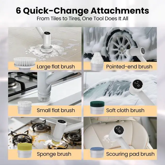 6 HEADS = 6 CLEANING TOOLS IN ONE: Why buy a separate brush for every mess? This kit includes everything: Large Flat Brush for floors, Cone Brush for grout lines, Sponge Brush for sinks, Scour Pad for ovens, and more. From tile grout to shower doors to car wheelsone tool does it all.