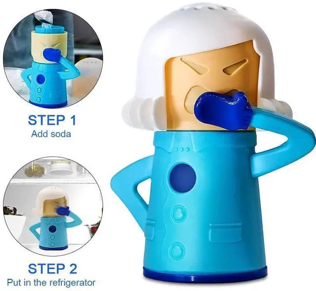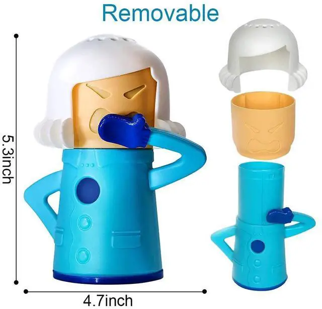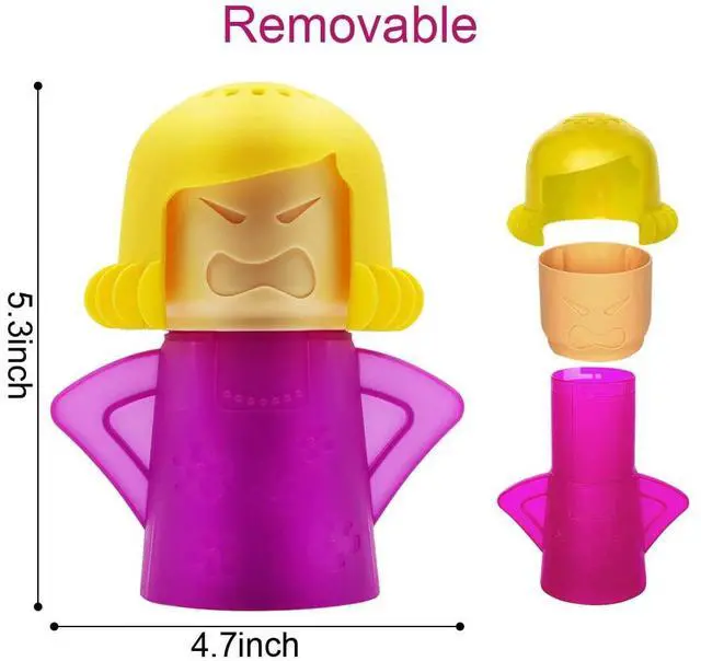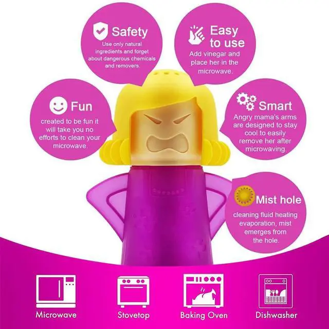 Hot steam comes out of Angry Mama's head to soften and release microwave dirt and stains for fast and easy cleaning.
