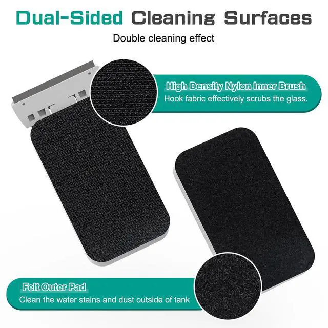 Double Cleaning Effect: This aquarium algae scraper glass cleaner designed with a high-density nylon inner brush and felt outer pad, the double-sided cleaning effect to scrub algae inside and remove water stains outside the glass efficiently.