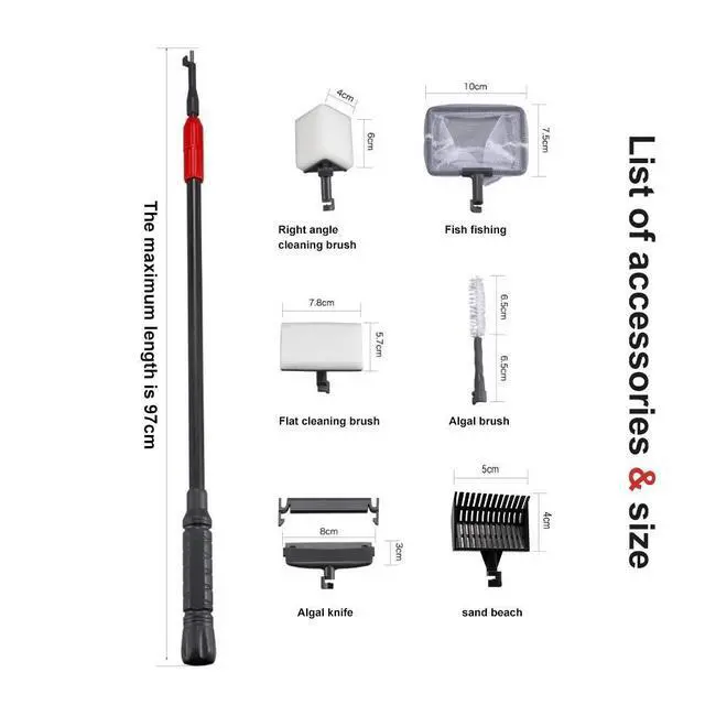 Adjustment range:19.7-38.1inch/ 50-97cm. This aquarium maintenance tools was specially developed for glass aquariums and has an long handle to keep the aquariums clean and immaculate.