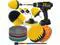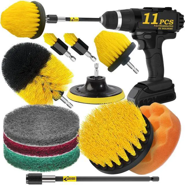 11 Piece Drill Cleaning Attachment SetBrush&Scouring pads&Scrub Sponge), Includes: 5 shape of Medium Yellow drill power scrubber brushes, 3 Piece different stiffnesses Scouring pads1 Piece scrub sponge and 4 inch backer and 1 Extension rod.