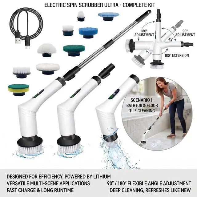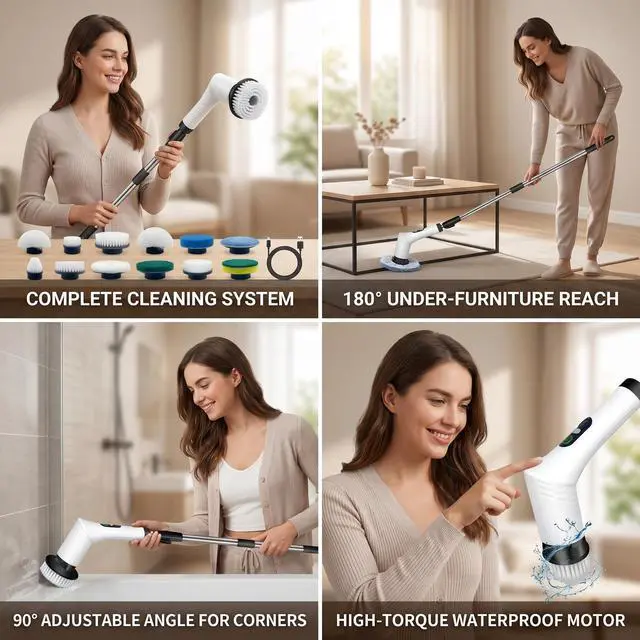 Spin Scrubber, 9-in-1 Multifunctional Electric Cleaning Brush with Detachable Handle, 9 Replaceable Brush Heads & LCD Display, Rechargeable for Bedroom, Bathroom, Kitchen, Car
