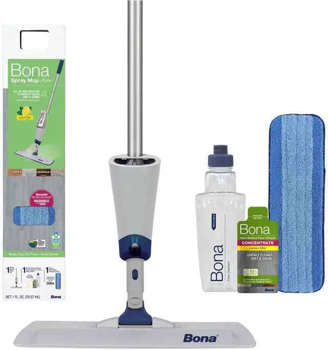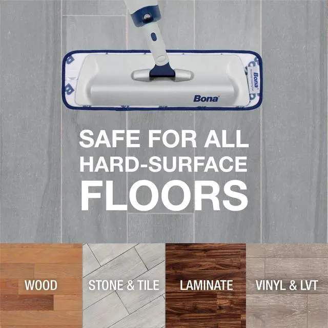 Comes with Bona Hard-Surface Floor Cleaner Concentrate. Simply pour the pouch into your Bona mop cartridge and fill the rest with water for a refreshing clean