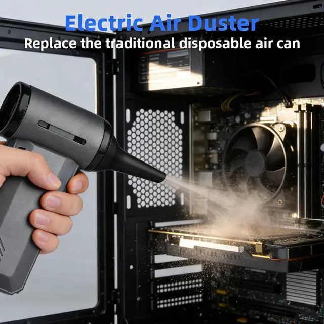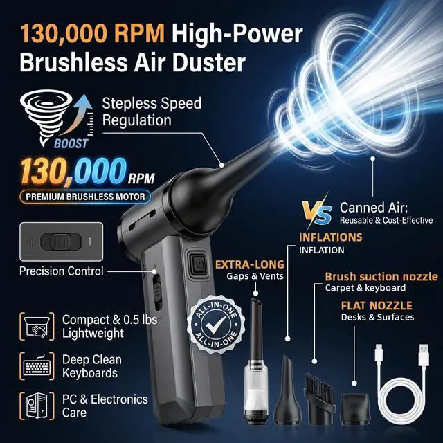 Pro-Grade 130,000 RPM Power & Stepless Speed Control: Engineered with a cutting-edge brushless motor peaking at 130,000 RPM, this electric air duster delivers a hurricane of air to blast away stubborn debris from GPU fins and radiator fans. Unlike fixed-speed models, our innovative stepless regulation allows you to precisely dial in the airflowgentle enough for delicate camera lenses, yet powerful enough for deep PC cleaning. Its the ultimate high-performance compressed air duster for tech enthusiasts and gamers.