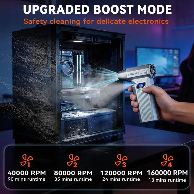 Powerful Turbo Fan: The compressed air duster is equipped with a powerful brushless motor with a maximum speed of 160,000 RPM, effectively removing dust and debris. It features 4-Gear adjustable speed settings and an LED light suitable for both delicate cleaning of precision electronic devices and various applications such as deep dust removal and lightweight inflation.