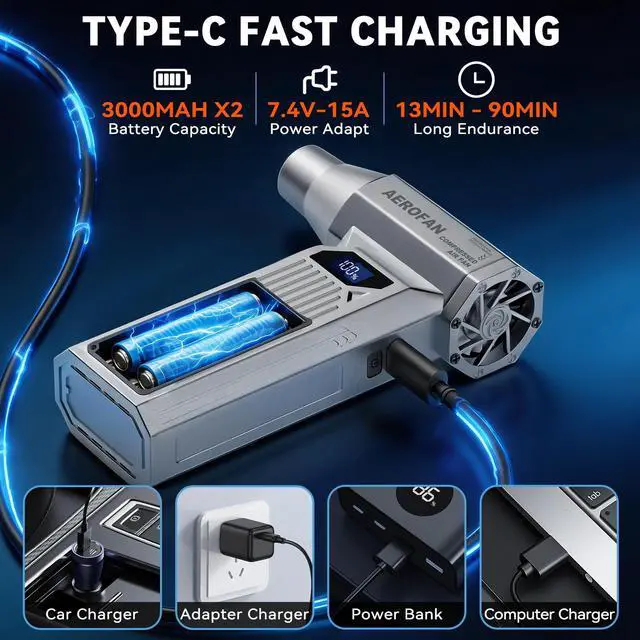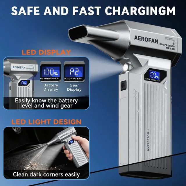 Rechargeable Air Duster: This air compressor duster supports Type-C fast charging, reaching a full charge in just 2.5 hours. Equipped with a built-in 6000mAh high-capacity battery, it offers a maximum runtime of up to 100 minutes in low-speed mode. Additionally, it features an LED display that allows you to monitor the remaining battery level and current wind speed setting at any time.