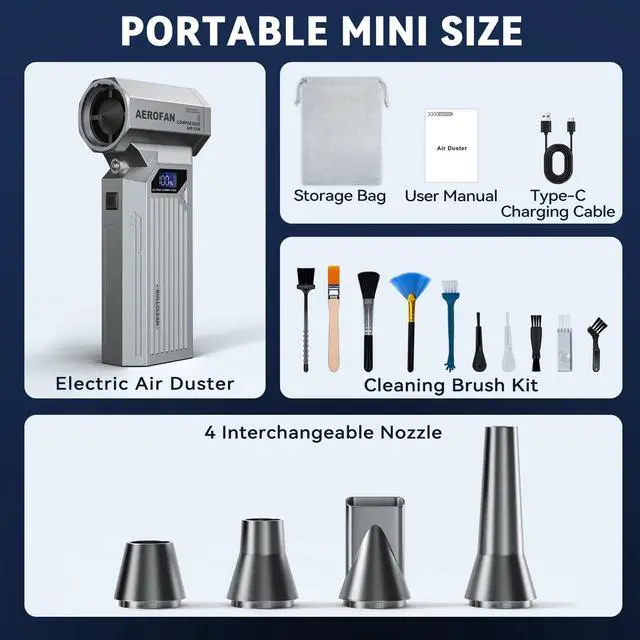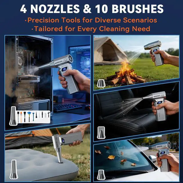 Versatile Electric Air Duster: The air duster comes with 4 nozzles and 10 brushes. Its suitable for cleaning keyboards, computer towers, car mirrors, vents, sofa crumbs, and more. Beyond cleaning, this versatile electric air duster can inflate, blow snow, and start a barbecue.