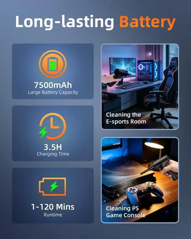 Durable & Cost-Saving Rechargeable Design Stop throwing money away on single-use cans! Built with a high-capacity rechargeable battery and durable ABS+PP material, our cordless air duster is designed for thousands of uses. Its not only kinder to your wallet but also to the planet. The included Type-C charging cable ensures you can easily power it up from your laptop, power bank, or wall adapter, making it a truly sustainable cleaning solution for your home and office.