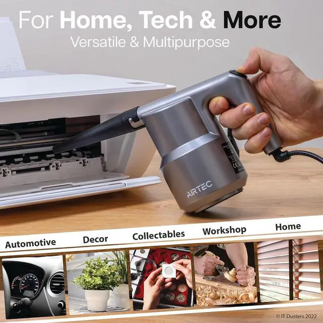 Unleash a continuous jet of fresh air to quickly remove stubborn dust and debris from wherever it may be lingering. No recharging or refills needed, AirTec runs directly from main’s power.
