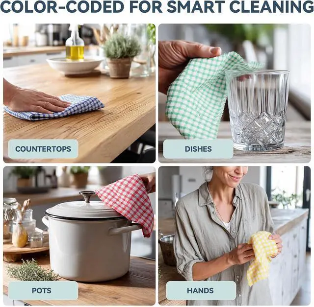 100% Premium Cotton - Crafted from?? 340 GSM 100% cotton lightweight and breathable.?? Our dish towels combine classic plaid texture with?? ultra-softness?? and?? scratch-free?? cleaninggentle on glassware non-stick pans and delicate surfacesSuper Absorbent & Quick-Drying?? -?? 3x faster water absorption?? than regular towels with?? raised checkered texture??. Our dish cloths?? tackle spills in seconds and dry faster to prevent odors keeping your kitchen cleanMulti-Color Set for Smart Organization?? - 12-piece set (12x12)?? in?? 4 vibrant colors (blue/green/red/yellow)?? assign colors to different tasks perfect for?? drying dishes wiping counters?? cleaning mirrors or even as?? decorative hand towels?? Durable & Fade-Resistant?? -?? Reinforced edges?? and?? colorfast dye?? withstand?? 50+ machine washes?? without shrinking or bleeding.