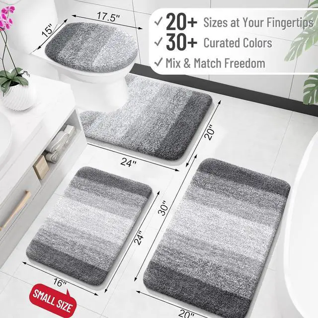 WARNING: Water under the bathroom rug can cause it to slip. Keep bottom of the bath rug dry! [Easy to Clean & Care] Our bathroom mats are machine washable for simple upkeep when needed. Wash them in cold water on a gentle cycle without using chlorine or bleach. For best results tumble dry on low heat or air dry. To maintain the color and texture avoid frequent machine washing. [Matching Collection Beautiful Décor & Versatile] Elevate your bathroom decor with our elegant gradient color stripe mats ideal for sinks showers and beyond. Coordinate with matching toilet lid covers and contour rugs for added warmth and style. Complete the ensemble with our complementing shower curtains. Perfect for enhancing your own space with sophistication.