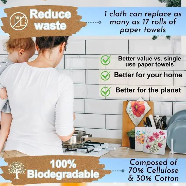 LONG LASTING: Natural materials make these reusable paper towels washable ensuring long-lasting use. These kitchen dish cloths maintain their integrity wash after wash offering a cost-effective and sustainable solution to disposable dish cloths for kitchen. Each swedish dish cloth can replace up to 17 rolls of paper towels.