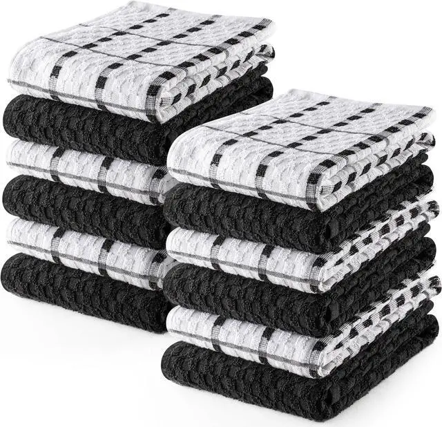 CottonValue Pack- Set includes 12 cotton dish towels with six black and six white dobby weave style kitchen towels measuring 15 x 25 inchesPremium Quality - Our kitchen towels are manufactured with premium quality 100% ring spun cotton making them elegant yet functional. Luxurious And Functional The towels are designed to give out luxurious experience while ideally fulfilling needs in general cleaning or washing. Soft And Absorbent Our towels feel soft and delicate on the skin while the composition enables them to be highly absorbent and durable. Organic Composition The material used in the manufacturing of the kitchen towel is natural and organic making it completely safe and reliable for use.