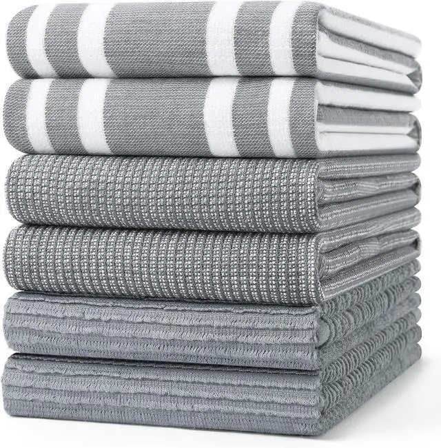& Pack: This set includes 6 towels with 2 each of 3 different styles. The varied designs and color options complements any kitchen décor make it easy to distinguish and use the right towels for different scenarios. The size of 18x28 is sufficient for many cleaning jobsEco-Friendly