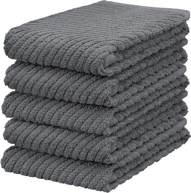 SOFT & ABSORBENT 100% terry cotton with a weight of 400 GSM highly absorbent and long-lasting use. TEXTURED PATTERN & DURABLE Features a lined texture that enhances absorbency and grip making these towels ideal for drying wiping and general kitchen tasks. EASY CARE Machine washable and built to last. Ideal for handling a variety of kitchen jobs from drying dishes to handling hot pots and pans. VALUE PACK Set includes 5 solid color cotton dishcloths available in a variety of colors to coordinate with any kitchen décor. Measures 16 in x 19 in. MULTIPURPOSE Great for drying cleaning cooking or even as reusable napkins or hand towels.