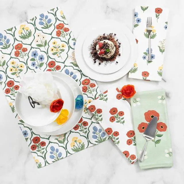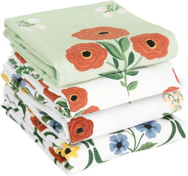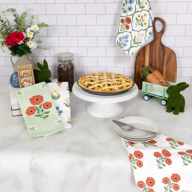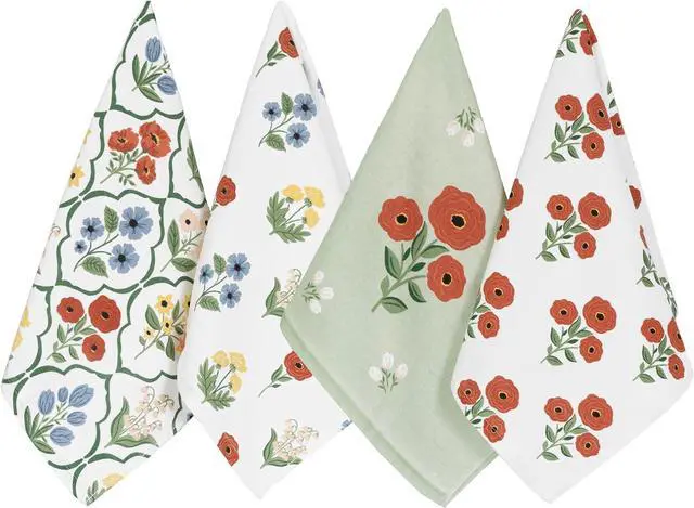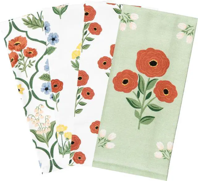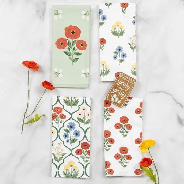 DOUBLE THE BLOOMS DOUBLE THE STYLE. This 4-piece set of spring-themed towels offers two sides for every job: a flat weave for a lint-free shine and a plush terry side for extra absorbency. The perfect pair for your springtime kitchen! SPRING FRESHNESS ALL IN THE DETAILS. With these 100% cotton towels measuring 16 x 26 (40 cm x 66 cm) each enjoy soft eco-friendly quality that effortlessly handles any kitchen task from Easter baking to garden party prep. MORE THAN JUST A TOWEL. Whether drying dishes or adding a pop of floral charm to your kitchen these versatile towels combine function and styleperfect for hosting decorating or simply soaking in the season! FROM PETAL-PERFECT TO LINT-FREE USE. The flat weave leaves your dishes lint-free while the plush side is perfect for drying hands and dishware making them a go-to choice for all your spring celebrations! FRESHLY PICKED AND EASY TO CARE FOR. Busy season? No problem! These towels are machine washable designed to keep their vibrant look and cozy feel even after many washes.