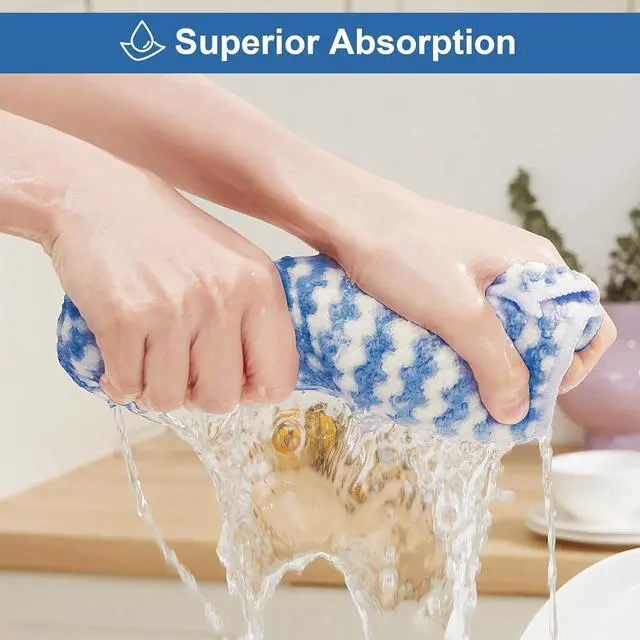 [Streak Free & Versatile Cleaning] The amazing absorbency to clean any surfaces in few wipes quickly also non-scratch without streak and on glass mirrors dishes & cups counters sink or kitchenware. [Ultra Soft Material & Health Safe Use] Made of 85% Polyester and 15% Polyamide fiber. Completely soft touch on the total microfiber fabric blend safe for hands when used as dish cloths for washing dishes. [Super Absorbent & Lint Free Rags] A kind of super absorbent kitchen towels or dish towels for kitchen drying. Fuzzy microfiber cloth surface provides great absorbency on liquids and stains but also lint free for long-term durable use.