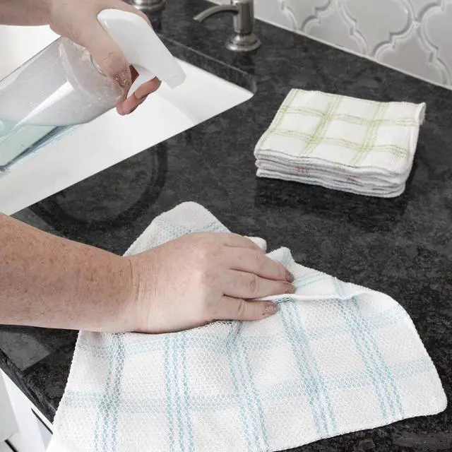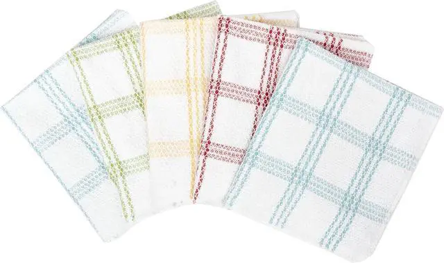 CottonDual-purpose. Soft absorbent 100% cotton side perfect for washing and drying and durable mesh side effective for scrubbing. Non-abrasive. Designed to clean gently without scratching delicate surfaces. Value pack of 5Standard-sized 12 in. by 12 in. (30 cm by 30 cm) dish cloths. Machine washable.