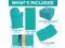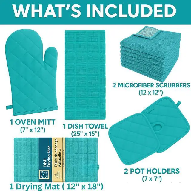 Includes: 1 Oven Mitt (7 x 12) 1 Dish Kitchen Towel (25 x 15) 1 Dish Drying Mat (12 x 18) 2 Microfibers scrubbers (12 x 12) and 2 Pot Holders (7 x 7). Soft Blue 7-PieceHeat-Resistant Oven Mitts and