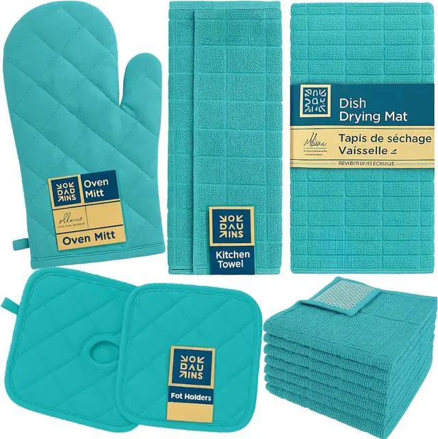 Daily Use: This all-in-one kitchen essentials bundle includes matching towels oven mitt pot holders dish cloths and drying mat. Its a complete solution found in the best kitchen towels and oven mitt sets. Durable Dish Cloths for