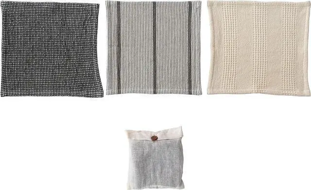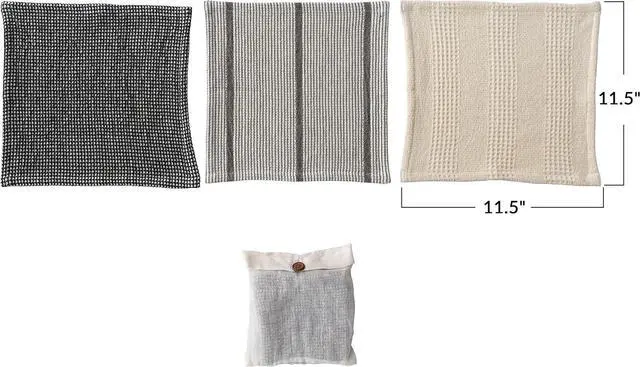 CottonThis farmhouse inspired set of cotton waffle weave dish cloths features 3 versatile hues and a stylish storage bagSet of 3 black grey and natural waffle weave dish cloths with functional loop and storage bagMachine Wash Warm Gentle Cycle Do Not Bleach Tumble Dry Low Warm Iron If Needed100% Cotton 10.5 L x 10.5