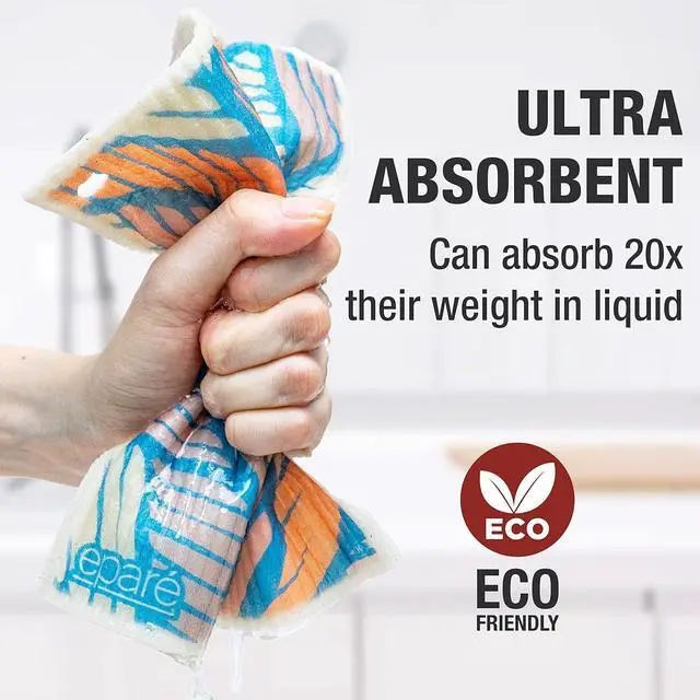 Maintain: These swedish dish towels reusable with hook makes them quick-drying and helps keep them clean. Materials used to create these reusable swedish towels are 100% sourced in Sweden. More Absorbent Than The Best Sponge: These swedish dishcloth paper towels made cleaning up the kitchen easier. These are made of cellulose that can absorb more than 20x its weight in liquid better than ordinary no odor dish cloths.