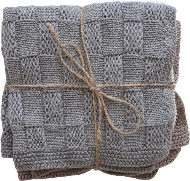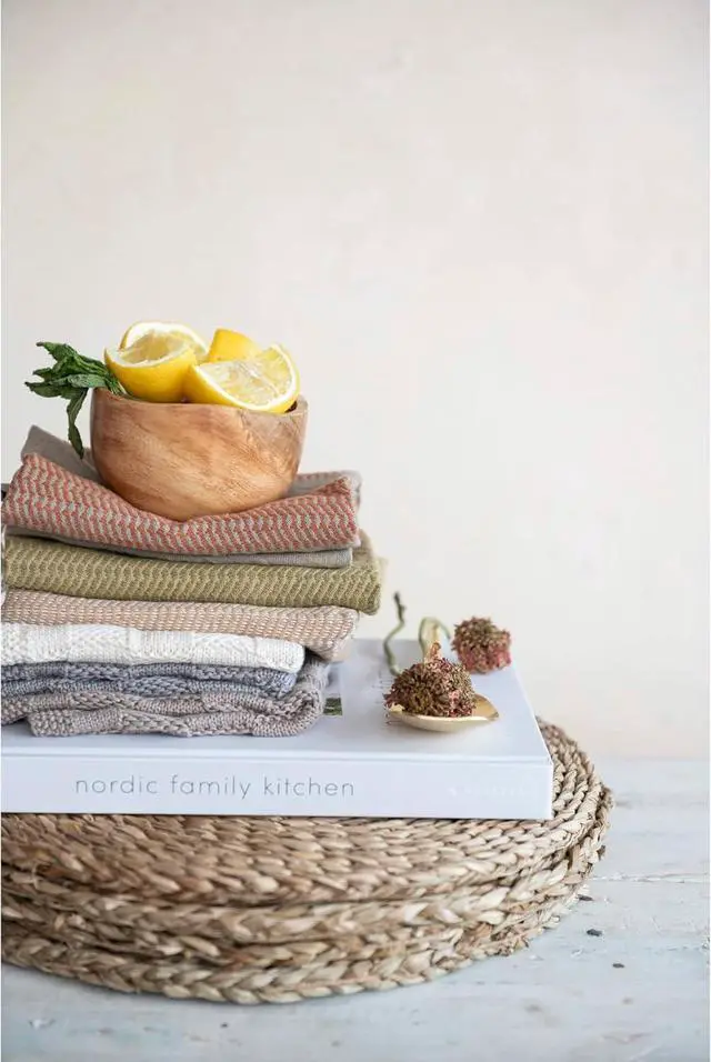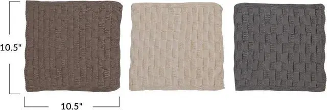 CottonThis farmhouse-inspired set of cotton blend dish towels features a stylish weave pattern in three stylish huesDisplay in a living or dining space of any style from Scandinavian to cottageMachine Wash Warm Gentle Cycle Do Not Bleach Tumble Dry Low Warm IronMade from cotton 10.5 inches L x 10.5 inches W x 0.25 inches H