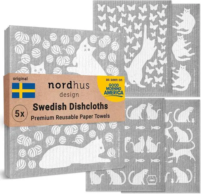 These reusable Swedish dishcloths are soft when wet and gritty when dry. Shockingly Absorbent cloths pick up water like a sponge. Each cleaning cloth absorbs more than half a cup of liquid before needing to be wrung out. They also pick up dry particles (like crumbs flour dust etc. ) instead of spreading them around like other kitchen rags. Unlike sponges however their large flat composition makes them dry fast avoid bad smells and clean more- faster. Now you can up your game by using these Swedish dish towels for kitchen use or anywhere around the house (or car! )Eco-Chic Packaging - Our cat Swedish dishcloths come in a charming 100% compostable package.