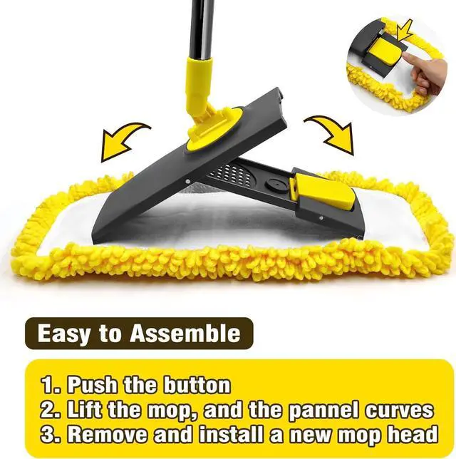 UNIQUE MOP HEAD DESIGN: It is super easy to install this kitchen mop. You just need to press the button, lift the mop, and the mop panel will be folded. Then you can easily insert or remove the mop pad.