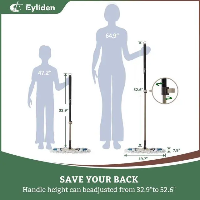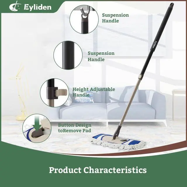 Wet & Dry Dust MopThe Eyliden push dust mop can easily deal with dead angles, pet hair, dust and dirt, and can be used for wet or dry floor cleaning. Longer length durable handle. With dry mode to dust or sweep, wet for mopping and scrubbing Hardwood, Tile, Laminate, Vinyl, Wood. Perfect mop for cleaning companies or home cleaning.