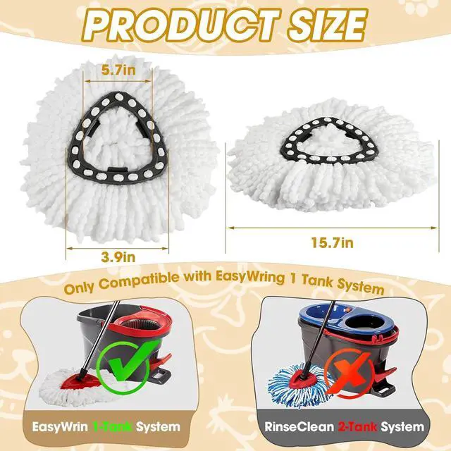 10 PACK MOP REPLACE HEAD: The soft and flexible mop replacement heads are perfect exact fit for triangle spin mop system for Easy Wring 1 Tank. Inner triangular rim size 3.9 " and the outer triangular rim size 5.7 " in diameter.