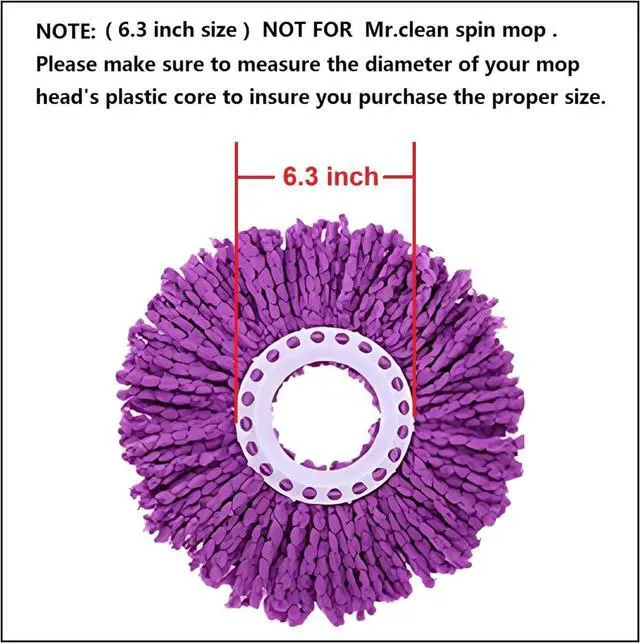 Inch SizeNOTE: Please make sure to measure the diameter of your mop head' s plastic core to insure you purchase the proper size. Our mop head is round and plastic core is 6.3 " diameter. Our mop heads fit most spin mops with a plastic round diameter between (6" - 6.3 " ). But NOT FIT the Mr. clean spin mop.
