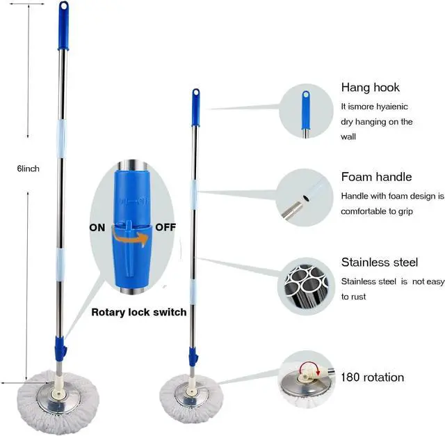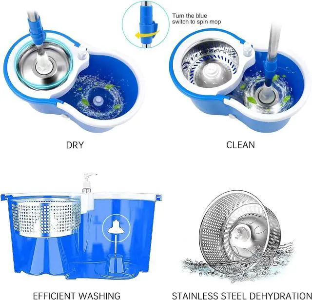 The spinning mop and bucket is wet or dry usage, 360° microfiber spinning mop head easily reaches any difficult corners and gaps without feeling the scrape, perfect for all types of surfaces, like laminate, hardwood, ceramic, tiles, glass, etc.