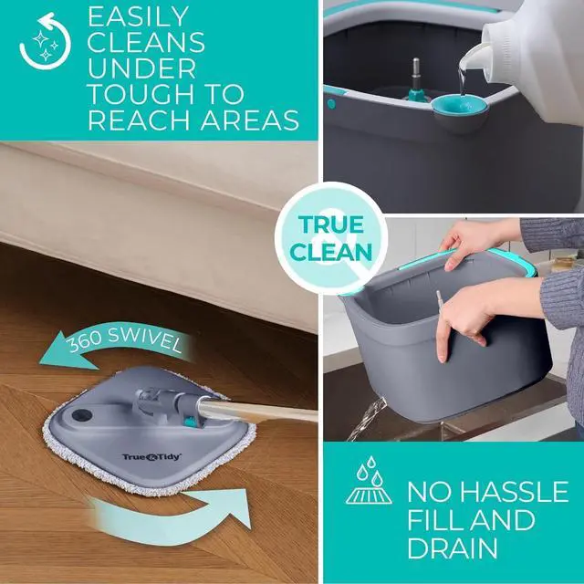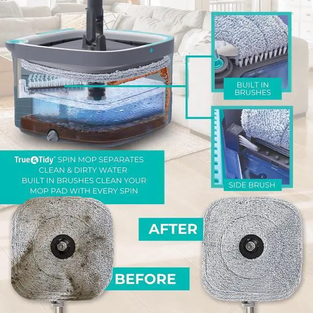 SELF-CLEANING & NO-MESS DESIGN The built-in scrubbing brush inside the bucket cleans and rinses your mop pad automatically with each spin, ensuring a fresh, debris-free mop every time.