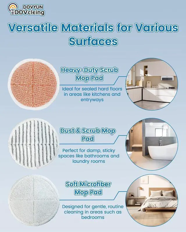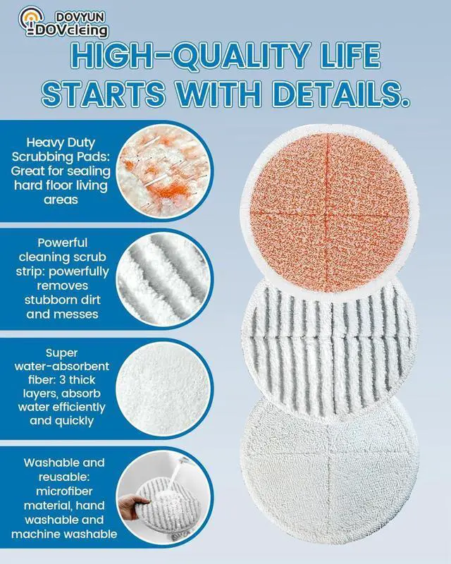 Suitable for a variety of scenarios: Three different strength of the mop mat, suitable for a variety of cleaning scenarios. White soft mop pads effectively clean hair & pet hair, debris and dirt without scratching your vinyl, wooden or tile floors; Grey gentle scrub mop mat perfect for cleaning bathrooms and laundry rooms; The orange heavy-duty scrub pad is perfect for cleaning any stubborn stains that seal hard floors.