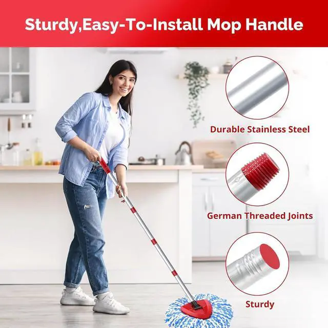 Adjustable 30-58 Inches Mop Pole: The mop replacement handle is made of high quality stainless steel, strong and durable. Comes with a 4-section handle that adjusts from 30 inches to 58 inches, no more bending over, saving your back and waist