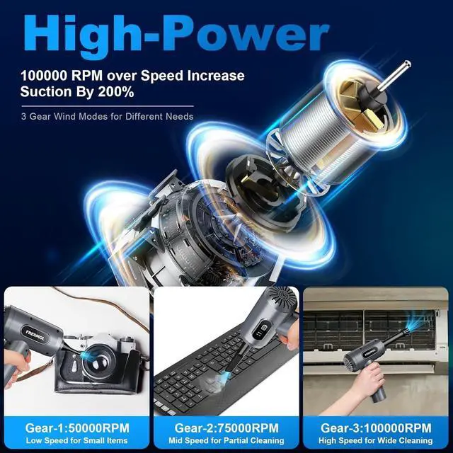 Powerful Performance:The air duster has a maximum speed of 100000 RPM motor with 3 gear adjustable airflow settings, providing 1.86-2.51 oz of blowing power. Allows you to customize the airflow for different cleaning needs. Provides efficient cleaning.