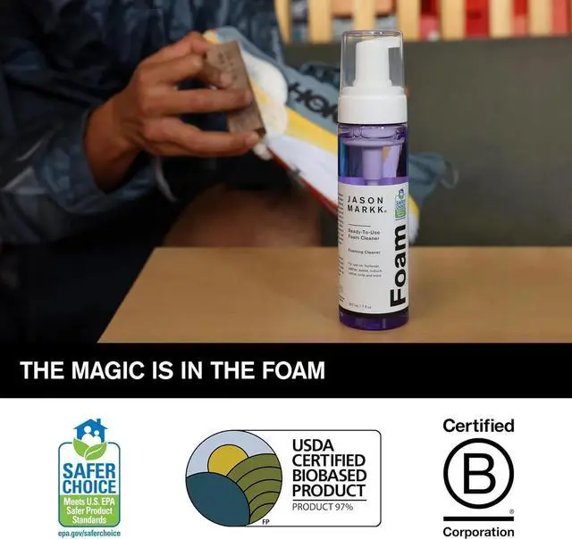 Jason Markk Ready-To-Use Foam Cleaner safely delivers a powerful, yet gentle clean for just about anything. The foaming solution is pre-mixed and ready-to-use straight out of the bottle. Simply pump and scrub, no extra water needed! It is safe to use on most colors and materials including leather, suede, nubuck, canvas, cotton, knits and more! We do not recommend cleaning unsealed or painted leather. Use extra care when cleaning dyed suede as the color could bleed with any water contact. The bottle and applicator are fully recyclable. Additionally, we proudly use Avery Dennison CleanFlake technology which ensures that labels and adhesive separate from PET every time, increasing the yields of pure PET flakes.